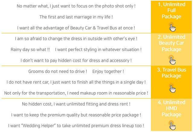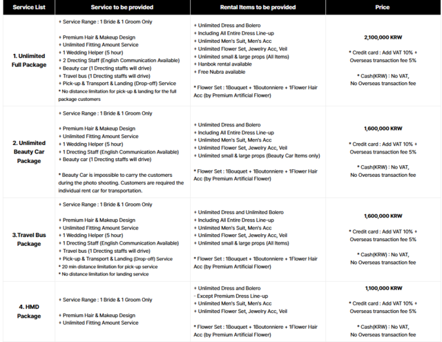 | 2. Unlimited Beauty Car Package | + Service Range : 1 Bride & 1 Groom Only + Premium Hair & Makeup Design + 1 Wedding Helper (5 hour) * Beauty Car is impossible to carry the customers during the photo shooting. Customers are required the individual rent car for transportation. | + Unlimited Dress and Bolero + Including All Entire Dress Line-up + Unlimited Men's Suit, Men's Acc + Unlimited Flower Set, Jewelry Acc, Veil | 1,600,000 KRW * Credit card : Add VAT 10% +