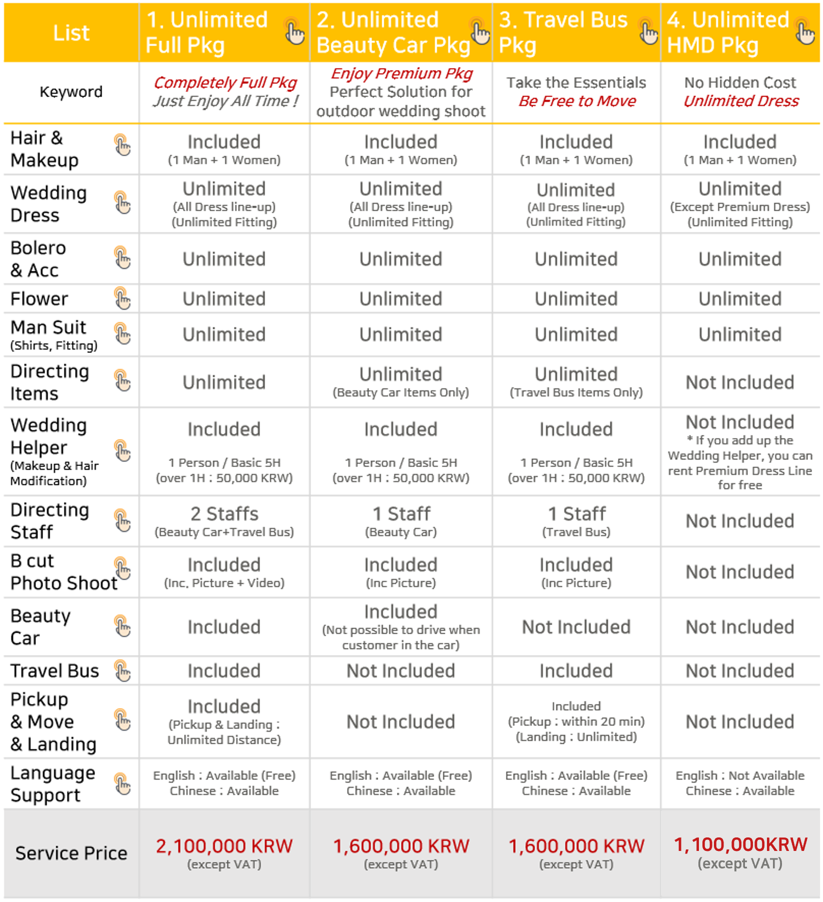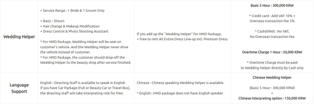 | Language Support | English : Directing Staff is available to speak in English If you have Car Package (Full or Beauty Car or Travel Bus), the directing staff will take interpreting role for free. | Chinese : Chinese speaking Wedding Helper is available * English : HMD package does not have English speaker | Chinese Wedding Helper (Basic 5 Hour : 300,000 KRW) + Chinese Interpreting option : 150,000 KRW |