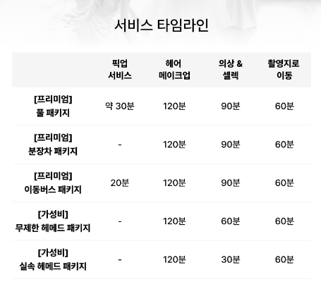 그리고 가성비 라인과 프리미엄 라인이 있는데 분장차와 이동버스를 제공하느냐 안 하느냐로 나뉘는 것 같더라고요.
