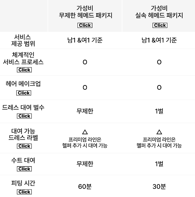 보통 헤메드 업체들을 보면 여자 드레스 2~3벌, 남자 슈트 1~2벌, 헤어 변형 1~2회 이후에는 추가금이 기본 구성인 경우가 많다.