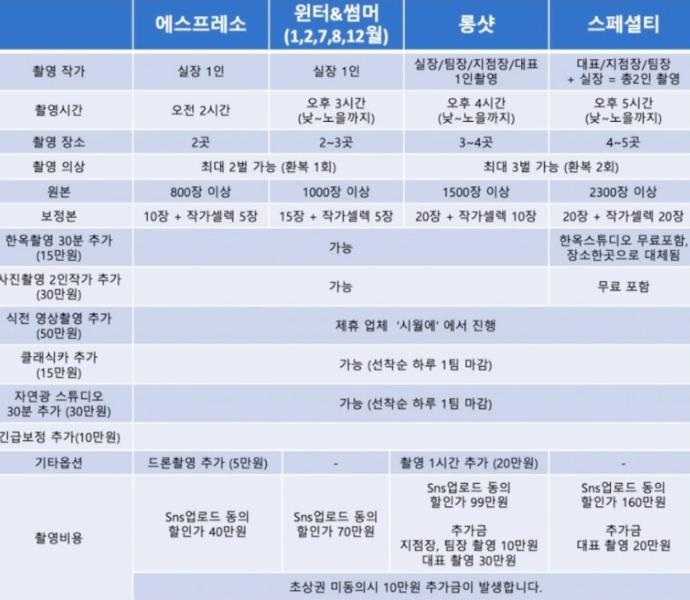 여름과 겨울엔 오후에 3시간만 촬영하는 상품도 있어서, 이런 상품을 활용해봐도 좋을 것 같습니다
