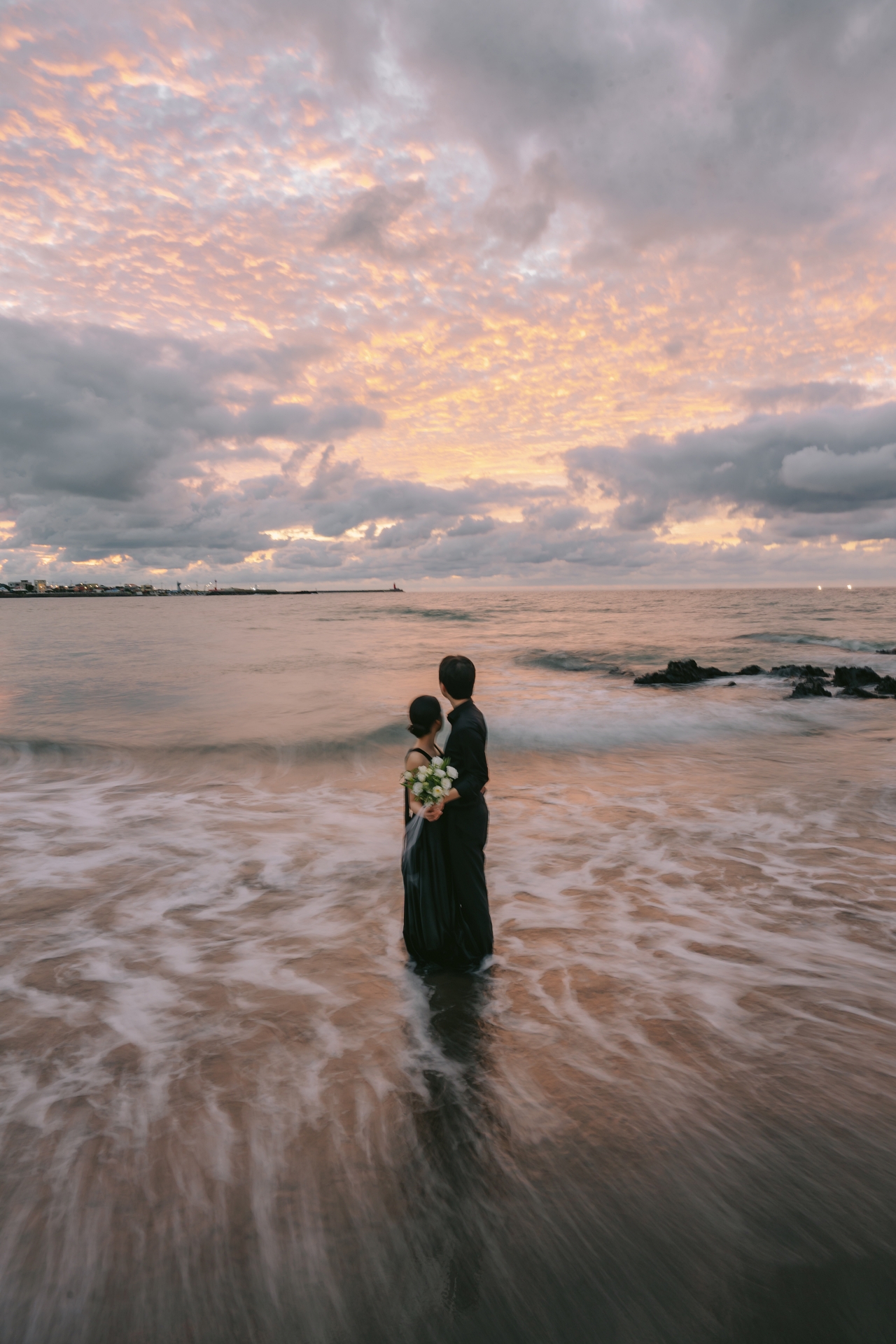 블랙컬러 드레스와 셔츠를 입고 물속에 발 담그면서 촬영하는데
