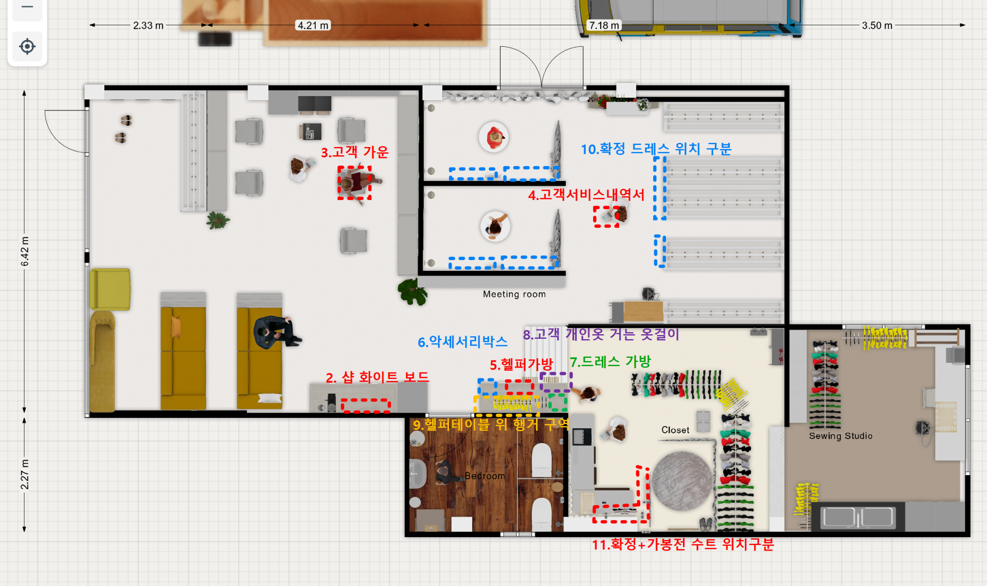 1.구글 캘린더 2.샵 화이트 보드 3.고객 가운 4.고객 서비스 내역서 5.헬퍼 가방 6.악세서리 박스 7.드레스 가방 8.고객 개인옷 거는 옷걸이 9.헬퍼 테이블 위 행거 구역 10.확정 드레스 위치 구분 11.확정+가봉 전 수트 위치 구분