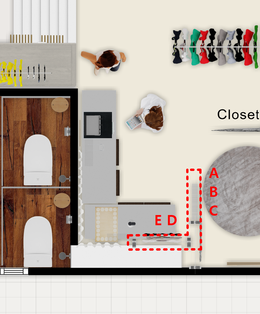 11 | 확정 +가봉 전 수트 위치 구분 | 가봉 전 수트는 구역으로 나눠 걸리게 됩니다. 안쪽 세탁실에서 가봉이 진행되어도 되지만, 일단은 피팅 직후+ 가봉 전 수트는 바로 저 위치에 구역으로 구분되어 걸립니다. 가봉이 완료된 수트는 헬퍼테이블 위 행거에 라벨에 따라 구분 되어 걸면 됩니다. |