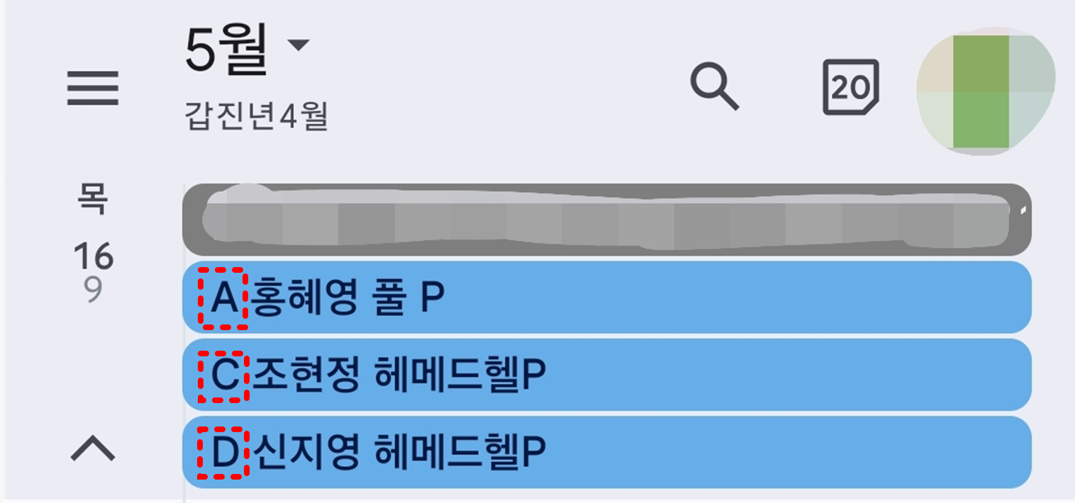 1 | 구글 캘린더 | 고객에게 부여된 라벨을 ‘고객분류’라고 부릅니다. 공유된 캘린더에서 가장 앞에 있는 알파벳이 고객에게 부여된 라벨 입니다. 예를 들면, 샵에서 A표시가 되어있는것은 모두 홍혜영 고객님의 대여품 또는 개인품 입니다. |